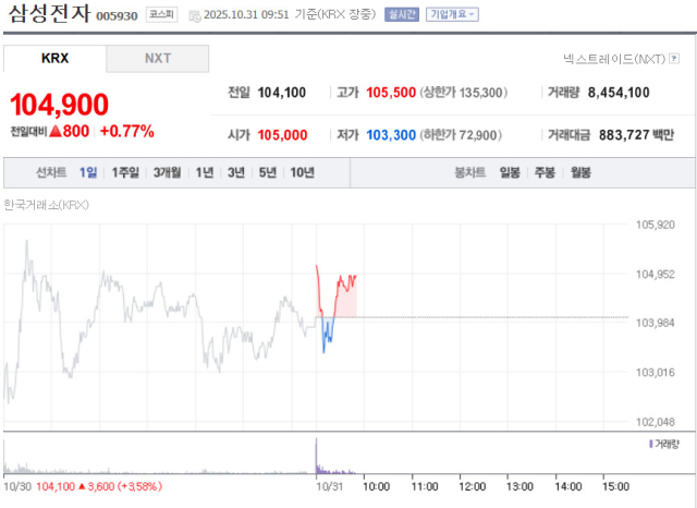 31일 한국거래소(KRX)에 따르면 오전 9시51분 기준 삼성전자 주가는 전일 대비 0.77% 증가한 10만4900원을 기록 중이다. 주가 10만원 회복 이후 추가 상승이 이어지면서 투자자 관심이 집중되고 있다.