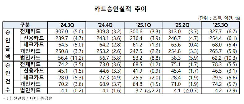 31일 여신금융협회가 발표한 '2025년도 3분기 카드승인실적 분석' 자료에 따르면, 올해 3분기 전체카드 승인금액 및 승인건수는 각각 327조 7000억원, 78억 3000만건으로 전년 동기 대비 6.7%, 5.5% 증가한 것으로 나타났다.