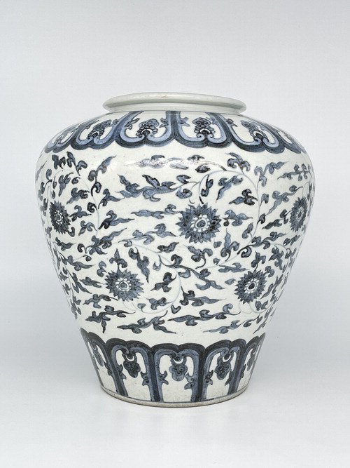 크리스티에 따르면 이 백자는 보상화무늬가 전면에 섬세하게 그려진 완형(둥근 공기 형태) 항아리다. 높이 27.9㎝, 지름 26.2㎝로 몸 전체에 청화 안료를 사용해 보상화무늬를 정교하게 그렸다. 어깨와 굽 부분에는 연화문 띠가 둘려 있으며, 투명한 유약이 전체를 감싼 형태다. 조선 전기에는 값비싼 중국산 청화 안료를 사용해야 했고, 왕실 전용으로만 제작이 허락돼 현존 유물이 극히 드물다.
