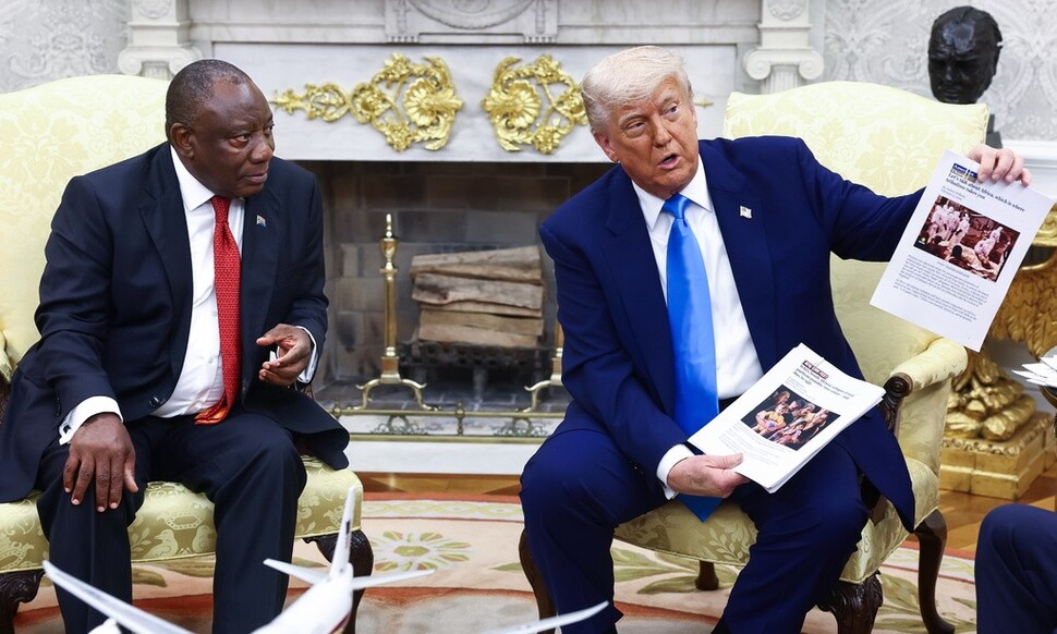 도널드 트럼프 미국 대통령이 지난 5월21일 백악관을 방문한 시릴 라마포사 남아공 대통령에게 남아공에서 백인 대량학살이 일어나고 있다고 주장하며 자료를 보여주고 있다. 이 자료들은 조작되거나, 잘못된 정보로 밝혀졌다. 워싱턴/EPA 연합뉴스 |