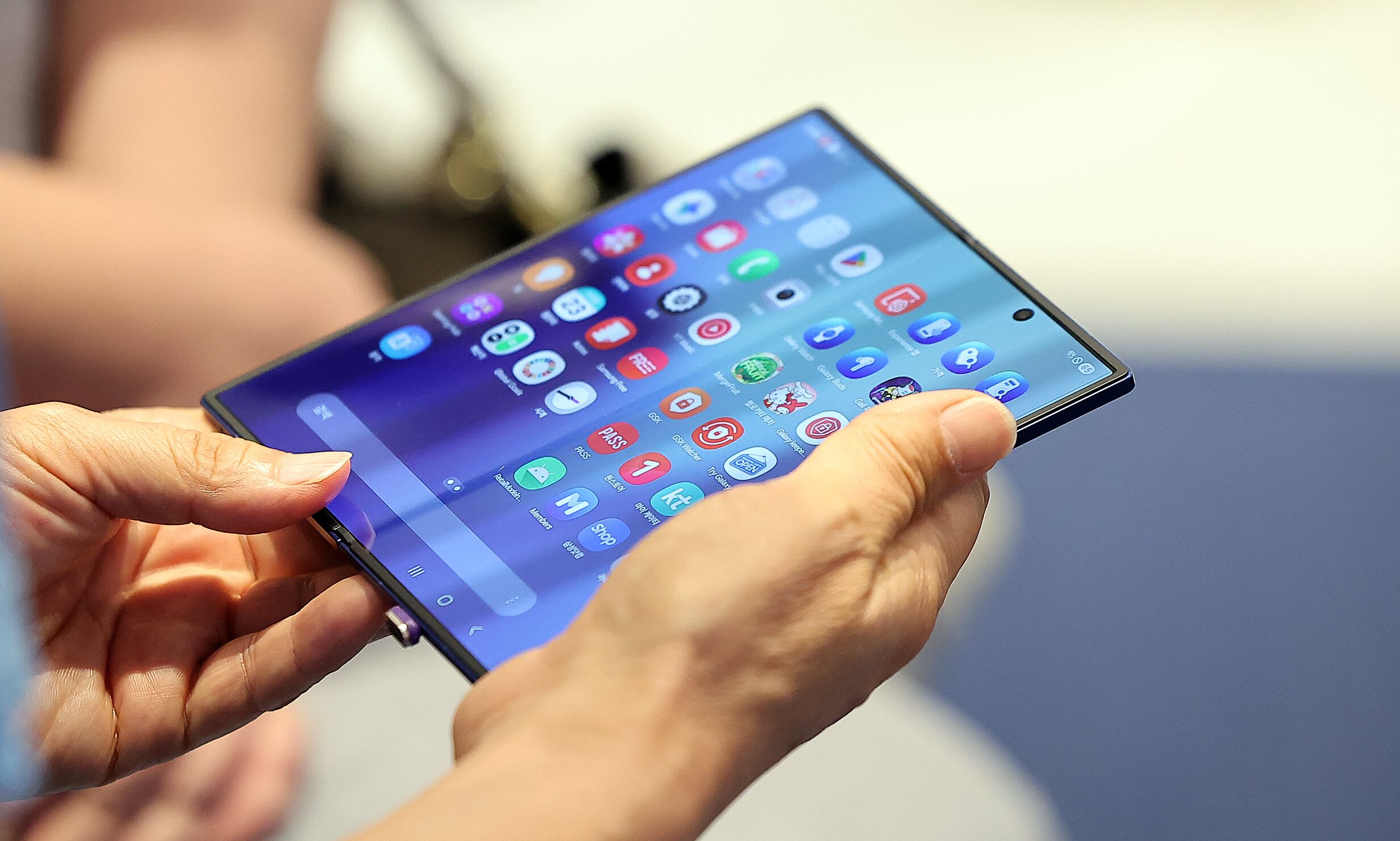 23일 서울 영등포구 여의도 더현대 서울에 마련된 갤럭시 스튜디오에서 한 시민이 진열된 갤럭시Z 폴드7을 살펴보고 있다./뉴스1 |