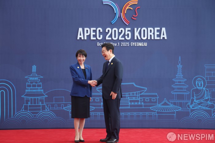 [서울=뉴스핌] 이재명 대통령이 31일 오전 경북 경주시 경주화백컨벤션센터(HICO)에서 열린 2025 아시아태평양경제협력체(APEC) 정상회의에 참석한 다카이치 사나에 일본 총리를 맞이하고 있다. [사진=APEC 2025 KOREA & 연합뉴스] 2025.10.31 photo@newspim.com
