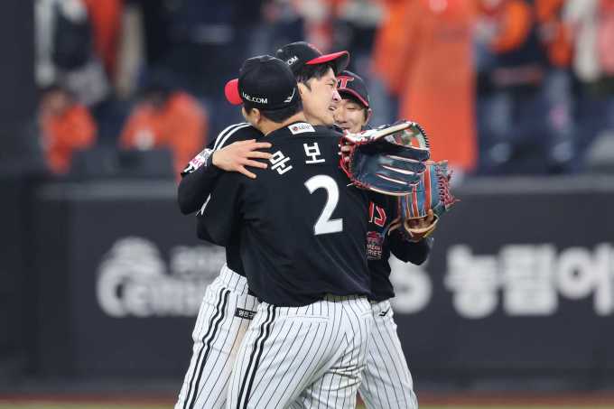 [서울=뉴스핌] LG의 내야수들이 지난 30일 대전에서 열린 KS 4차전에서 극적인 역전승을 거두자 서로 껴안고 있다. [사진 = LG] 2025.10.30 wcn05002@newspim.com |