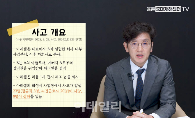 서울고등법원 고법판사 출신 송민경(사법연수원 32기) 법무법인 율촌 변호사가 아리셀 사건 1심 판결을 분석했다. 송 변호사는 최근 유튜브 채널 ‘율촌 중대재해센터TV’에 출연해 “경영책임자 판단은 형식적 직함이 아닌 실질적 의사결정권 보유 여부가 기준”이라고 설명했다.
