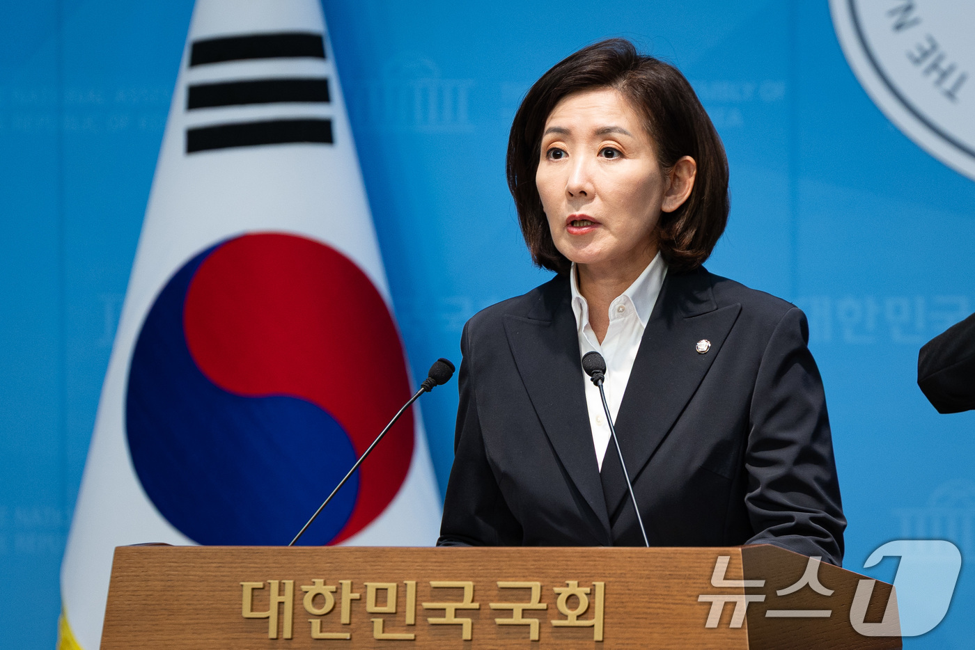 나경원 국민의힘 의원이 31일 서울 여의도 국회 소통관에서 법제사법위원회 국정감사 총평 기자회견을 하고 있다. 2025.10.31/뉴스1 ⓒ News1 유승관 기자 |