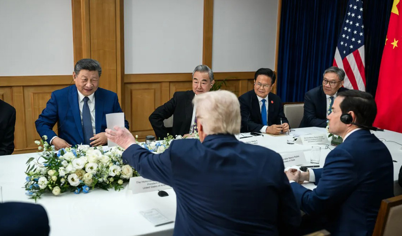 ▲ 2025년 10월 30일 부산 김해국제공항 소재 김해공군기지 내 접견장인 나래마루에서 열린 미-중 양자 정상회담에서 도널드 트럼프 미국 대통령이 시진핑 중국 국가주석에게 종이를 보여주고 있다.