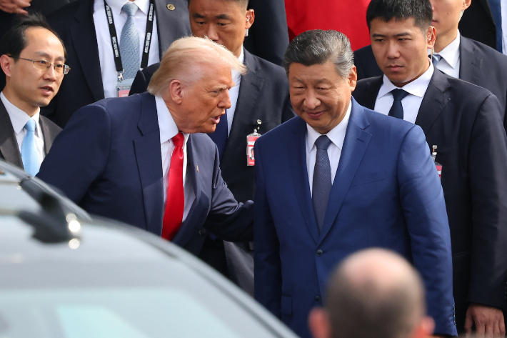 도널드 트럼프 미국 대통령과 시진핑 중국 국가주석이 지난달 30일 부산 공군 제5공중기동비행단 내 나래마루에서 미중 정상회담을 마친 뒤 회담장을 나서고 있다. 연합뉴스 |