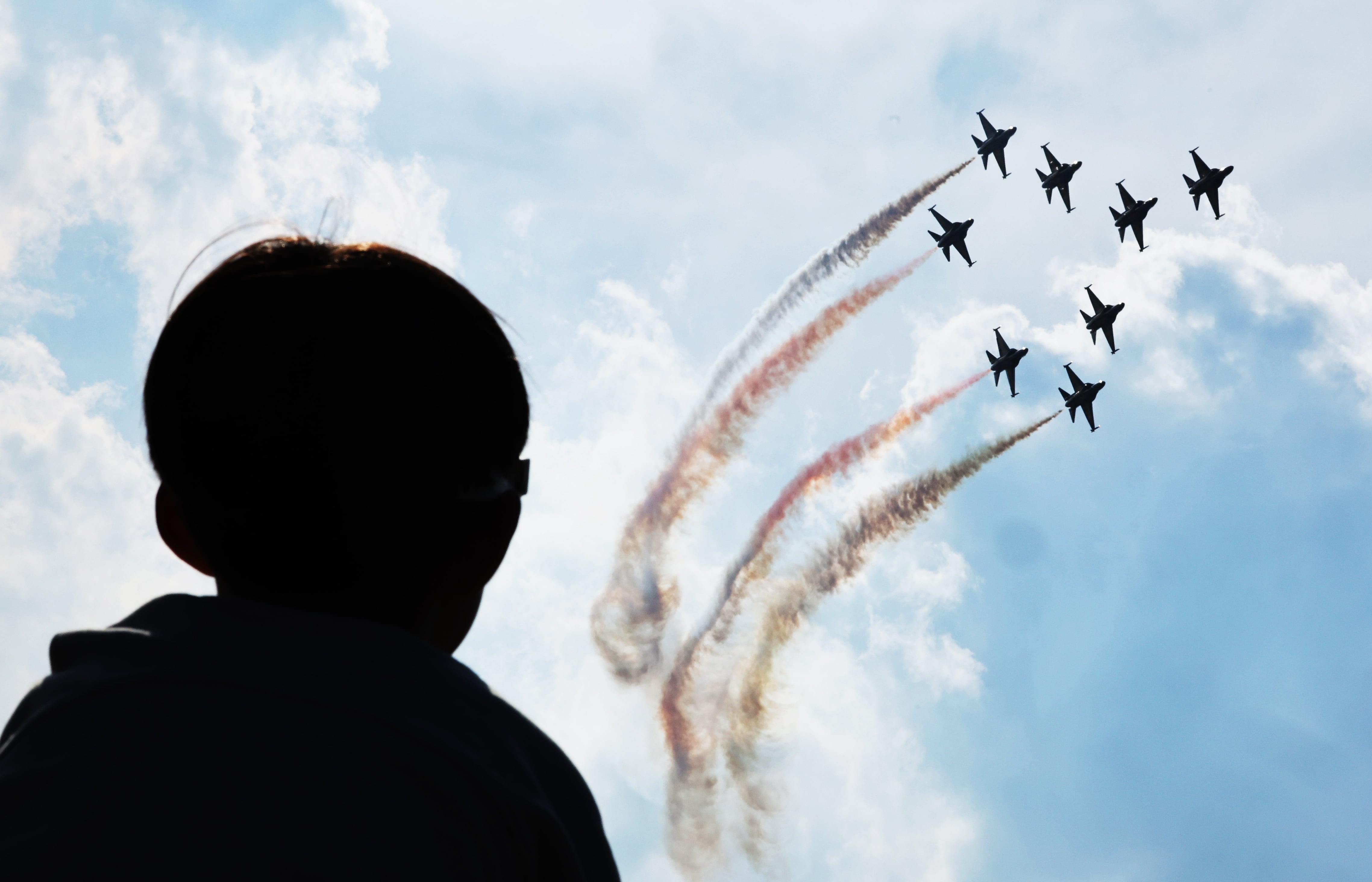 19일 경기도 성남시 서울공항에서 열린 '서울 국제항공우주 및 방위산업 전시회(ADEX)'에서 공군 특수비행팀 블랙이글스가 에어쇼를 선보이고 있다. /연합뉴스 |