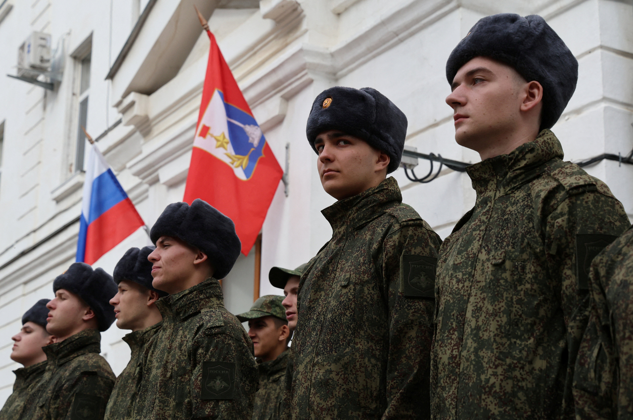 22일 크림반도 흑해 항구 도시 세바스토폴에서 열린 군 복무 소집 병사들의 부대 배치를 기념하는 행사에서 러시아 병사들이 줄을 서 있다. [로이터] |