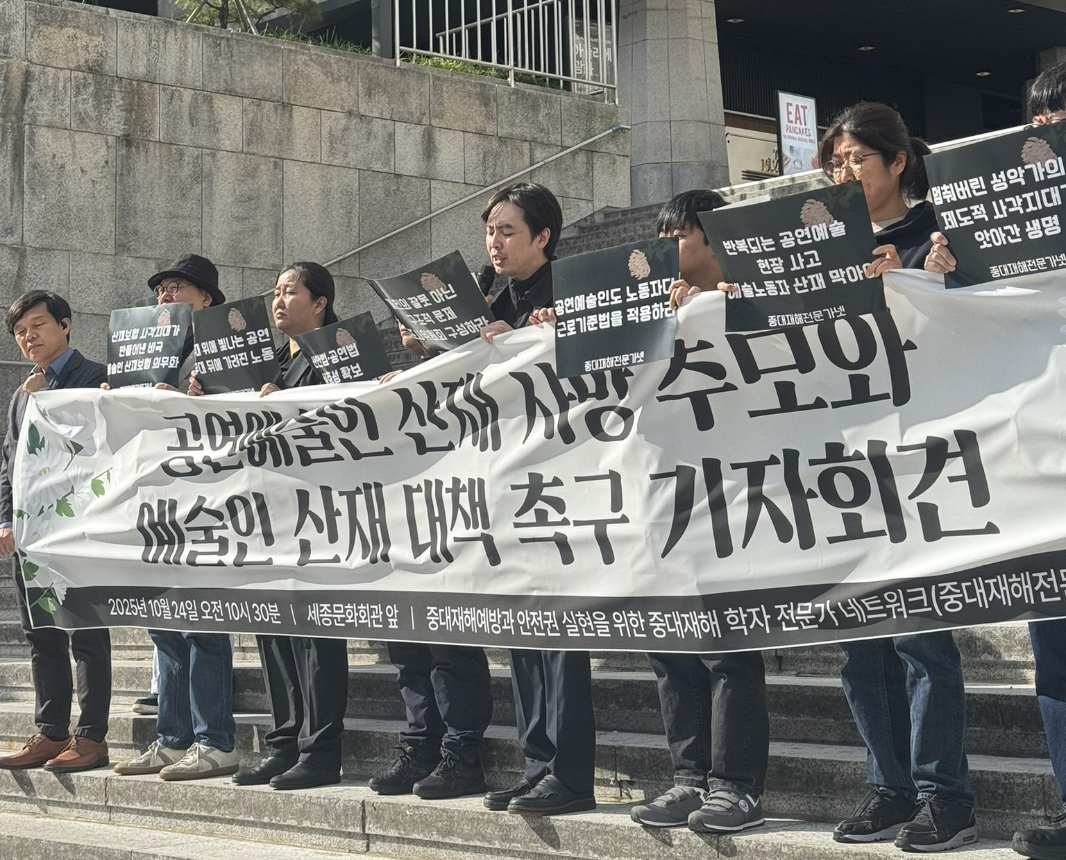 ‘중대재해 예방과 안전권 실현을 위한 학자·전문가 네트워크’가 지난달 24일 서울 종로구 세종문화회관 앞에서 기자회견을 열고 있다. 이들은 “반복되는 예술인의 산업재해를 방지할 대책을 마련해야 한다”고 촉구했다. 중대재해전문가넷 제공 |