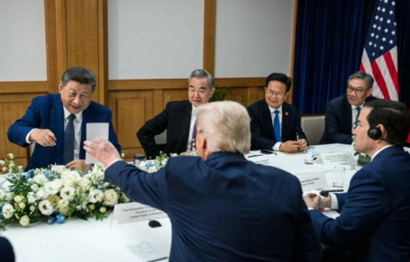 종이에 어떤 내용 있길래… 시진핑 파안대소 지난달 30일 부산 김해국제공항 공군기지 나래마루에서 열린 미중 정상회담에서 도널드 트럼프 미국 대통령(앞줄 왼쪽)이 보여준 종이를 보며 시진핑 중국 국가주석(뒷줄 왼쪽)이 환하게 웃고 있다. 종이에 어떤 내용이 적혀 있었는지는 알려지지 않았다. 사진 출처 미국 백악관 X |