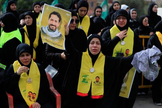 최근 이스라엘의 공습으로 사망한 헤즈볼라 전사 5명의 장례 행렬이 진행되는 가운데 조문객들이 슬픔에 잠겨 애도하고 있다. AP연합뉴스 |