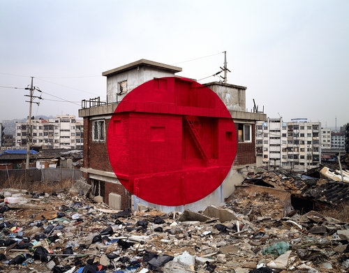 당시 처음으로 한국을 방문한 작가는 "서울 한복판에서 철거를 앞둔 낡은 양옥집 외벽에 사라질 공간을 기념하기 위해 붉은 원을 그렸다"고 회상한다.