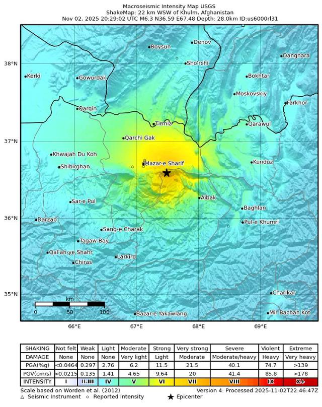 미국 CNN방송에 따르면 아프가니스탄 현지시간으로 3일 오전 1시쯤 마자르이샤리프시와 쿨름 마을 인근 지하 28㎞ 깊이에서 규모 6.3 지진이 발생했다. 아프가니스탄 북부 발흐주 주도인 마자르이샤리프는 아프가니스탄 전체에서 4번째로 큰 도시이며, 북부에서 가장 인구가 많은 도시 중 하나다. 인구는 약 40만 명 정도로 추정된다.