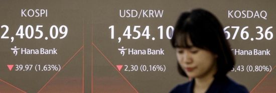 코스피가 전 거래일 대비 44.32포인트(1.81%) 하락한 2400.74에 개장한 11일 서울 중구 하나은행 딜링룸에서 딜러들이 업무를 보고 있다. 서울 외환시장에서 원달러 환율은 전 거래일 대비 2.4원 내린 1454원에 거래를 시작했다. 2025.4.11. 강진형 기자 |