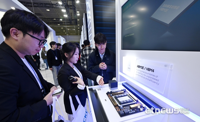 지난달 22일 열린 반도체대전에서 참관객이 삼성전자 'HBM4'를 살펴보고 있다. 이동근기자 foto@etnews.com |