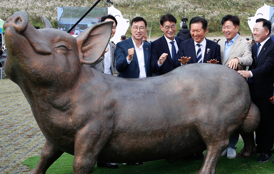 정청래 더불어민주당 대표가 지난달 25일 오후 제주시 애월읍 봉성리 새별오름에서 열린 '2025 제주도새기축제'를 찾아 제주 돼지 조형물 앞에서 기념촬영하고 있다. 뉴시스 |
