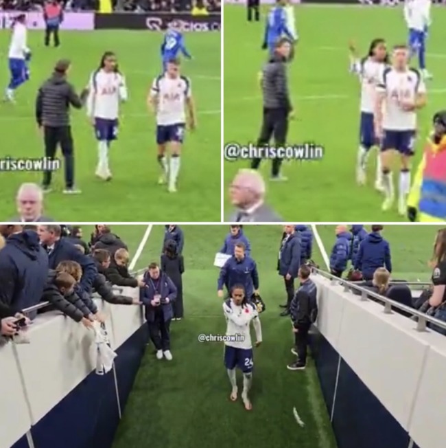 경기 후 나온 장면도 화제를 모았다. 토트넘 프랭크 감독은 킥오프 휘슬이 울린 뒤 그라운드로 들어갔다. 그는 제드 스펜스와 반 더 펜에게 무언가 이야기를 건네며 손을 내밀었으나, 선수들이 무시하고 지나쳤다. 프랭크 감독은 선수들을 바라본 채 별다른 반응을 보이지 않았다.