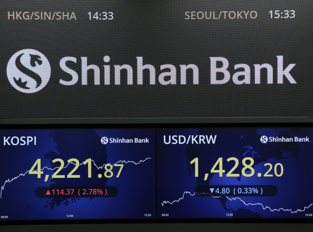 3일 마감된 국내 증시에서 코스피 지수는 전거래일대비 114.37p(+2.78%)오른 4221.87로 마쳤다. 사상 최고치를 다시 한번 경신했다. 코스닥도 1.57% 오르며 914.55로 장을 종료했다.