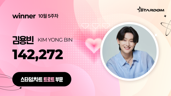 한편 김용빈은 10월 5주차 '스타덤 차트' 음원 부문에서도 '어제도 너였고 오늘도 너여서'로 1위를 기록하면서 6주 연속 정상을 지켰다. 배우 부문 주간랭킹에서는 김수현이 3주 연속 1위에 올랐다. 아이돌 부문에서는 피프티피프티가 2주 연속 정상에 올랐다.