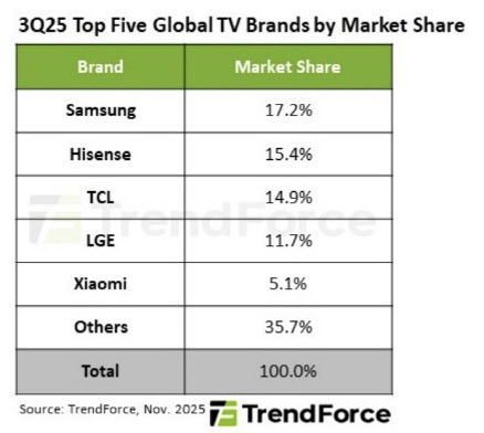 3일 시장조사업체 트렌드포스에 따르면 올해 3분기 글로벌 TV 시장 출하량 기준 삼성전자의 점유율은 17.2%로 1위였다. 중국 하이센스(15.4%)가 2위, TCL(14.9%)가 3위를 차지했다. LG전자(066570)는 11.7%의 점유율로 4위에 머물렀다.