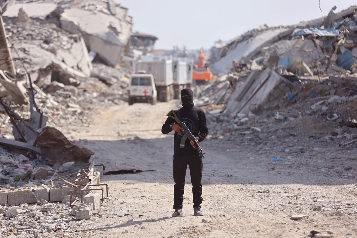 2일(현지시간) 가자시티에서 팔레스타인 무장정파 하마스 대원이 이스라엘 인질 유해를 송환을 위해 도착한 국제적십자사(ICRC) 차량 근처에 서 있다. AFP연합뉴스 |