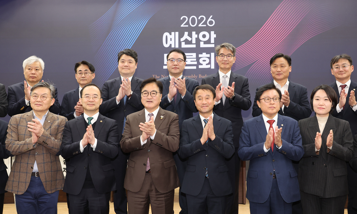 3일 서울 여의도 국회 의원회관에서 열린 2026년도 예산안 토론회에서 우원식 국회의장, 한병도 예결위원장 등 참석자들이 기념촬영을 하고 있다. 연합뉴스 |