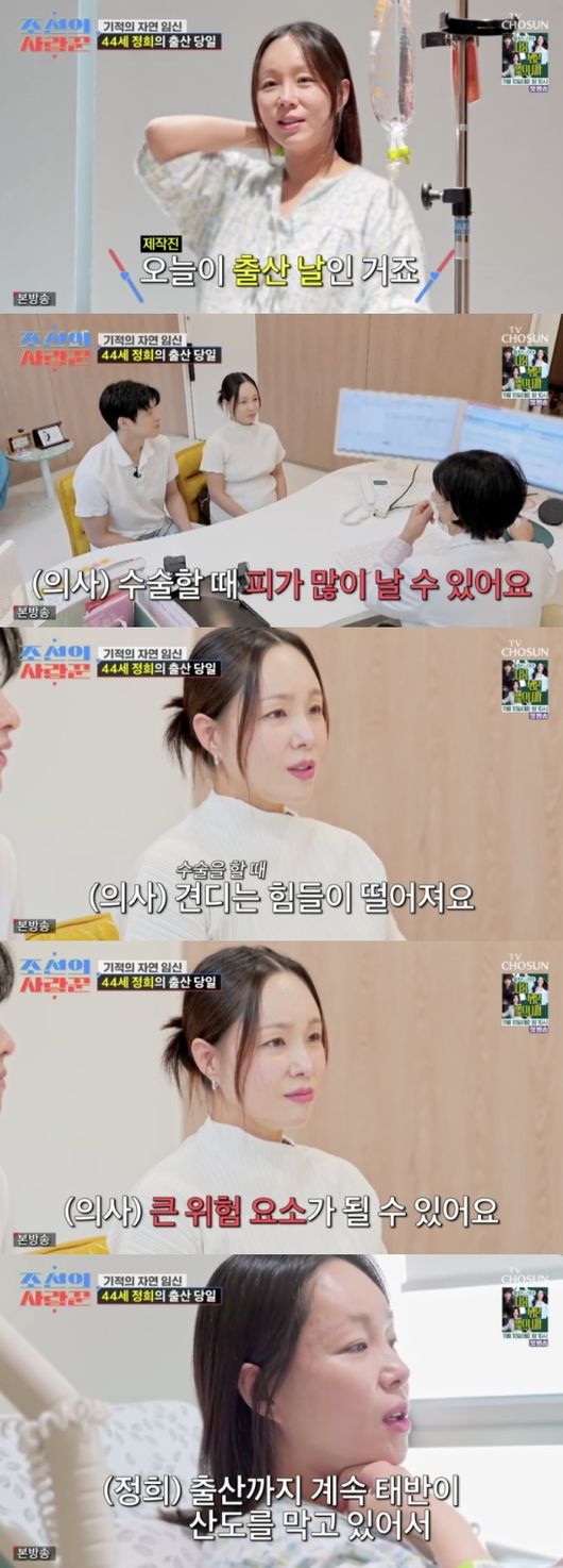 의사는 “수술할 때 피가 많이 날 수 있다. 핏줄이 노출돼서 피가 솟는다. 임정희 씨가 노산이다. 견디는 힘들이 떨어진다. 큰 위험 요소가 될 수 있다”라고 말했다.