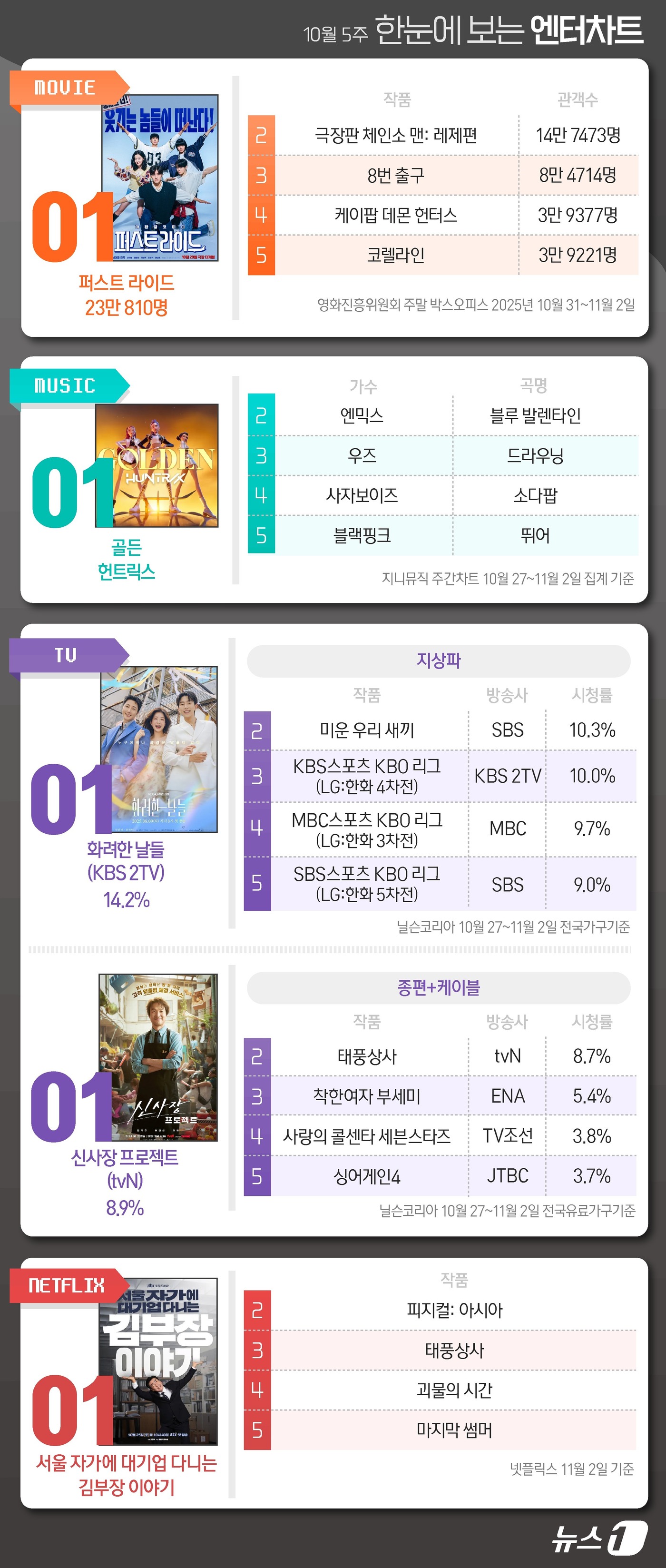 ◇ 영화='퍼스트 라이드' 1위(영화진흥위원회 영화관 입장권 통합 전산망 2025년 10월 31일~11월 2일)