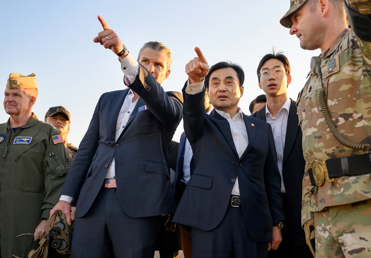 안규백 국방부 장관과 피트 헤그세스 미국 국방부 장관이 지난 3일 경기도 파주 비무장지대(DMZ) 최북단 경계초소인 오울렛 초소(OP)를 방문해 일대를 시찰하고 있다. 국방부 제공. |