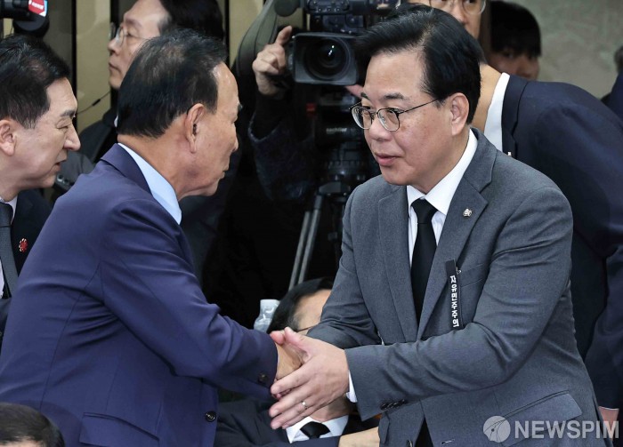 [서울=뉴스핌] 윤창빈 기자 = 송언석 국민의힘 원내대표가 4일 오전 서울 여의도 국회에서 열린 의원총회에 참석하고 있다. 2025.11.04 pangbin@newspim.com