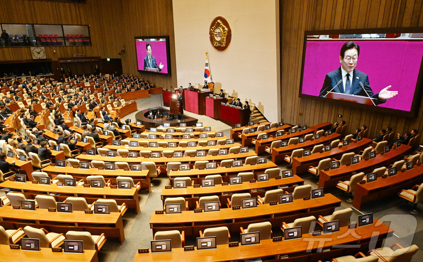 (서울=뉴스1) 국회사진기자단 = 이재명 대통령이 4일 여의도 국회에서 내년도 정부 예산안에 대한 시정연설을 하고 있다. 국민의힘은 이날 열린 시정 연설에 불참했다. 2025.11.4/뉴스1