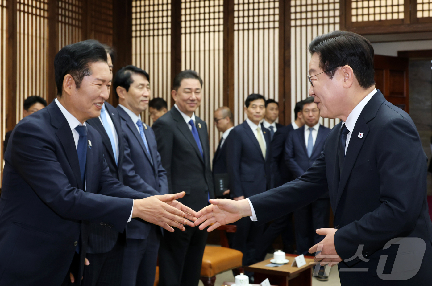 (서울=뉴스1) 국회사진기자단 = 시정연설을 위해 국회를 방문한 이재명 대통령(오른쪽)이 4일 서울 여의도 국회 의장접견실에서 열린 환담에서 정청래 더불어민주당 대표와 악수하고 있다. 2025.11.4/뉴스1