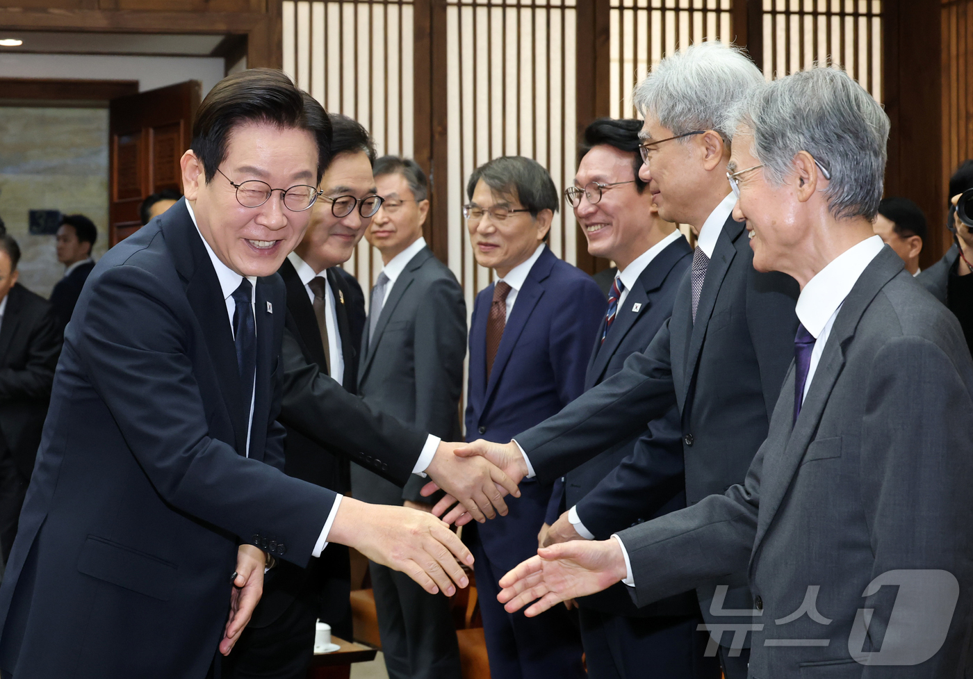 (서울=뉴스1) 국회사진기자단 = 시정연설을 위해 국회를 방문한 이재명 대통령(왼쪽)이 4일 국회의장접견실에서 열린 환담에서 조희대 대법원장(오른쪽)과 악수한후 지나가고 있다. 2025.11.4/뉴스1