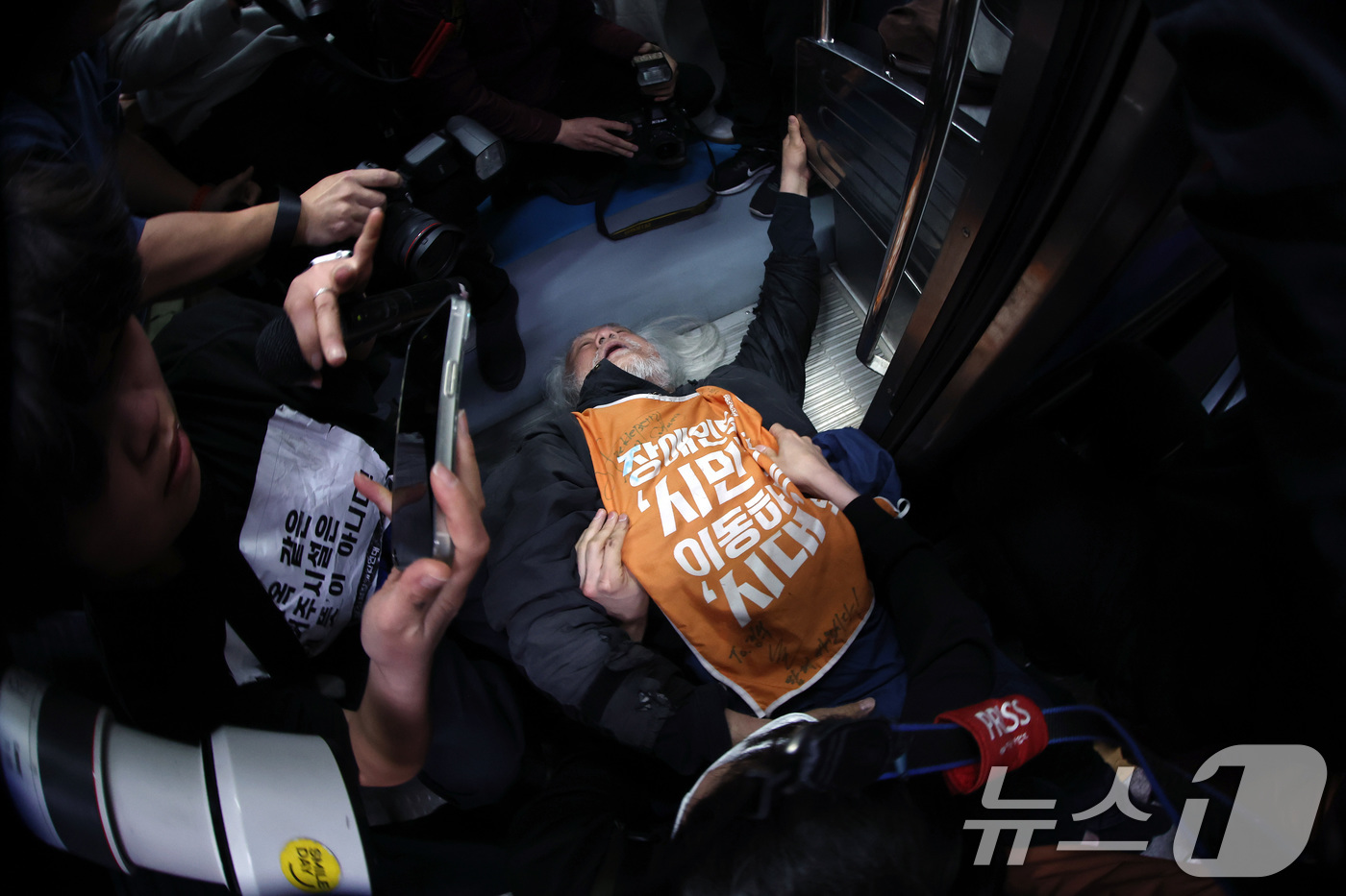 박경석 전국장애인차별철폐연대(전장연) 대표가 지난4월 21일 서울 지하철 4호선 혜화역 동대문 방면 승강장에서 제62차 '출근길 지하철 탑니다' 시위를 벌이던 중 이를 저지하던 경찰·서울교통공사 직원 등과 충돌하며 열차 입구에 넘어져 있다. 2025.4.21/뉴스1 ⓒ News1 이동해 기자 |