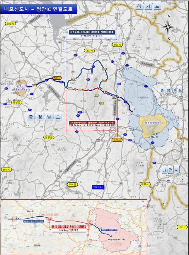 내포신도시~정안IC 연결도로는 세종시로 가는 연결도로망을 확충하기 위해 건설이 추진된다. 도는 도로가 건설되면 국도 43호선과 연결돼 세종시로의 접근성이 크게 개선될 것으로 기대하고 있다.