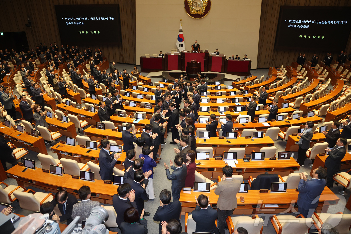 (서울=뉴스1) 국회사진기자단 = 이재명 대통령이 4일 오전 국회 본회의장에서 2026년도 예산안 및 기금운용계획안에 대한 시정연설을 하기 위해 입장하고 있다. 2025.11.4/뉴스1