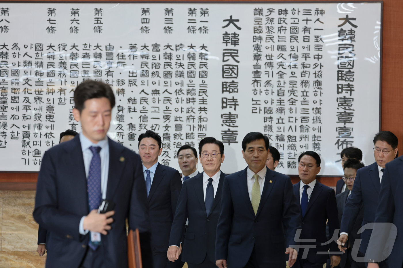 (서울=뉴스1) 국회사진기자단 = 이재명 대통령이 4일 오전 서울 여의도 국회에서 시정연설 하기 위해 본회의장으로 이동하고 있다.2025.11.4/뉴스1