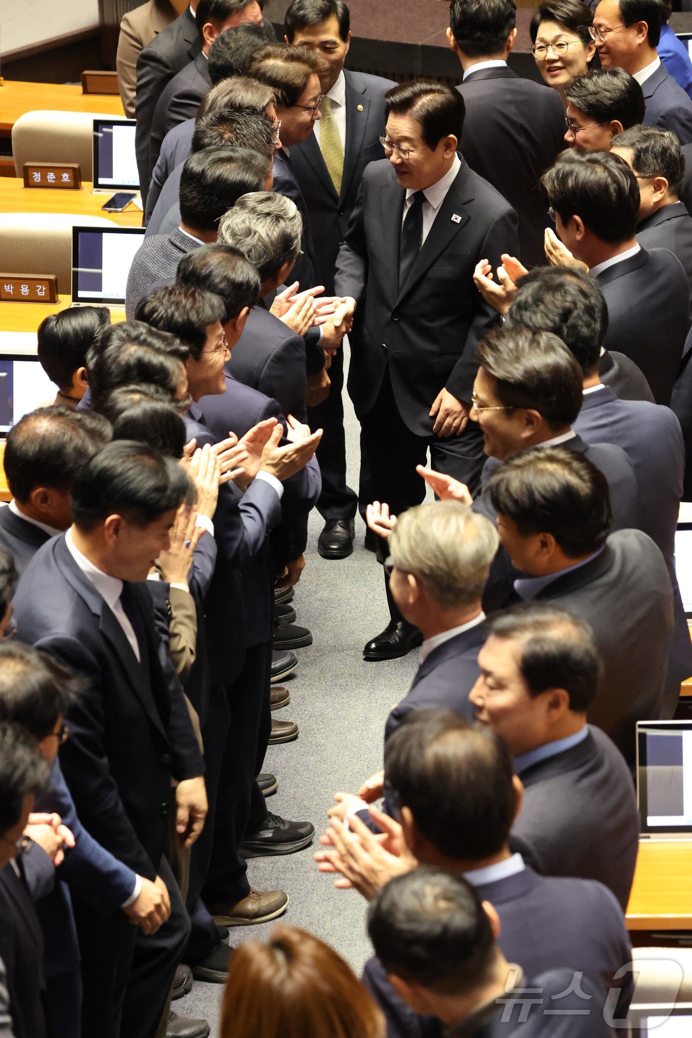 (서울=뉴스1) 국회사진기자단 = 이재명 대통령이 4일 서울 여의도 국회 본회의에서 내년도 정부 예산안에 대한 시정연설을 마치고 의원들의 박수를 받으며 퇴장하고 있다. 2025.11.4/뉴스1