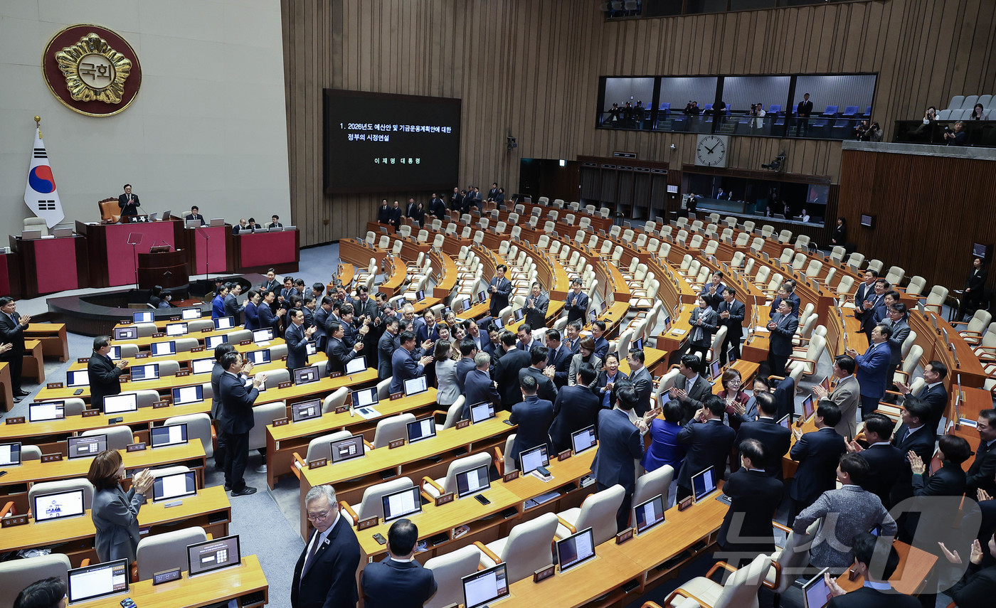 (서울=뉴스1) 국회사진기자단 = 이재명 대통령이 4일 오전 국회 본회의장에서 더불어민주당 의원들의 박수를 받으며 내년도 예산안 관련 시정연설을 하기 위해 본회의장으로 들어오고 있다. 국민의힘 의원들은 이날 불참했다. 2025.11.4/뉴스1