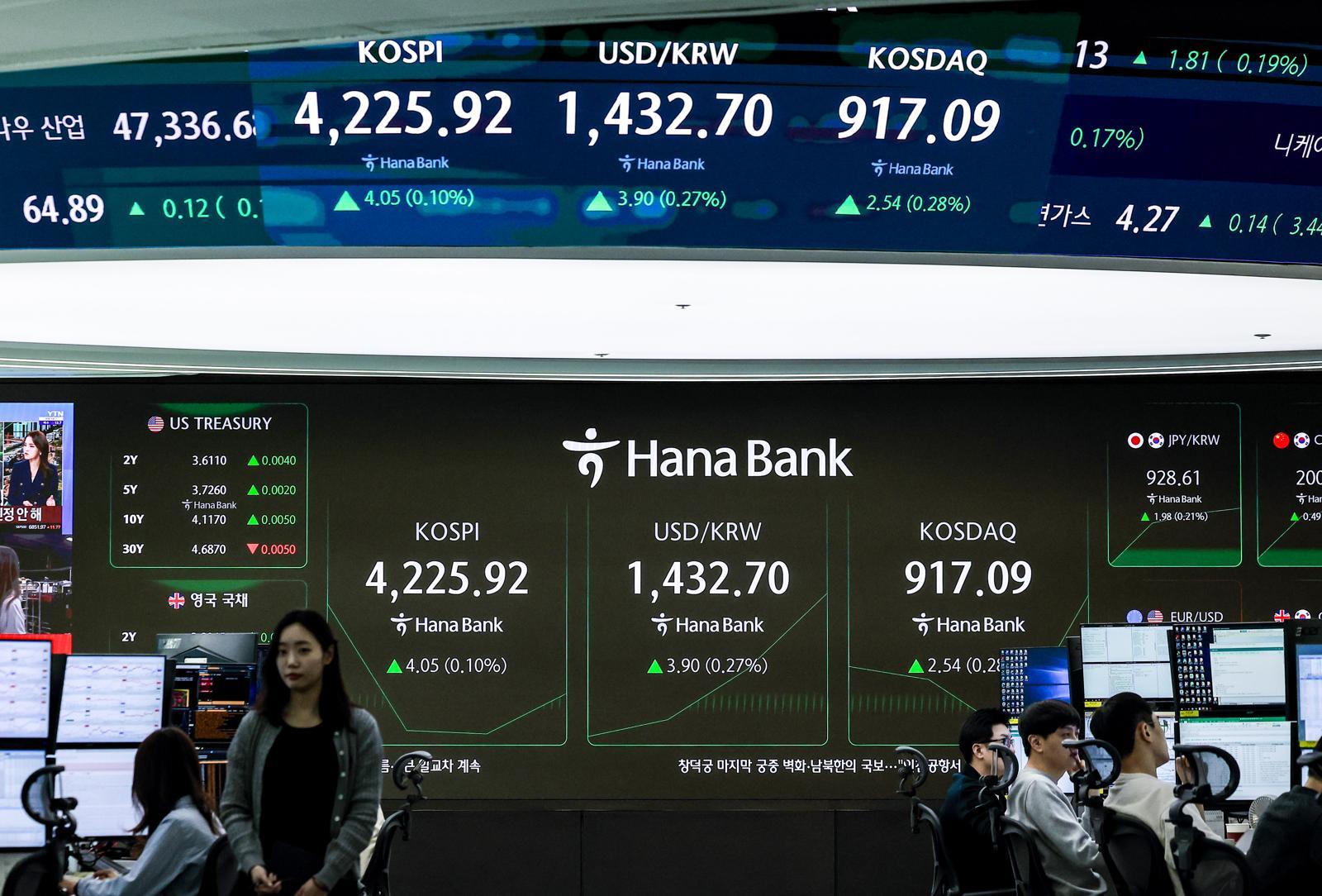 4일 서울 중구 하나은행 딜링룸에서 직원들이 업무를 보고있다. 코스피는 전 거래일(4221.87)보다 2.63포인트(0.06%) 내린 4219.24에 개장했다. 코스닥 지수는 전 거래일(914.55)보다 0.32포인트(0.03%) 상승한 914.87에 거래를 시작했다. 서울 외환시장에서 원·달러 환율은 전 거래일(1428.8원)보다 1.7원 오른 1430.5원에 출발했다. 2025.11.04. [서울=뉴시스] |
