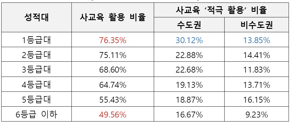 반면 중·하위권 학생들은 사교육의 필요성을 덜 느끼거나 경제적 부담 등으로 참여율이 낮은 경향을 보였다.또 수도권 1등급 학생의 30.1%가 사교육을 적극 활용한 반면, 비수도권 1등급은 13.8%로 절반에도 못 미쳤다.