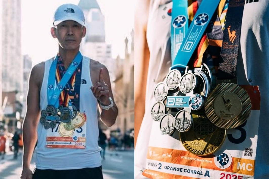 사진 속 션은 각 대회의 완주 메달을 목에 걸고 뉴욕 도심 거리에서 포즈를 취하고 있다.