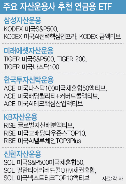 인공지능(AI)을 테마로 하는 ETF도 연금계좌 추천 상품으로 꼽혔다. 삼성운용은 AI 시대 글로벌 전력 수요가 늘어나는 국면에서 수혜를 볼 수 있는 ‘KODEX 미국AI전력핵심인프라’를, KB운용은 미국 기업 중 AI 밸류체인별로 핵심 기업에 투자하는 ‘RISE 미국AI밸류체인TOP3Plus’를 추천했다.