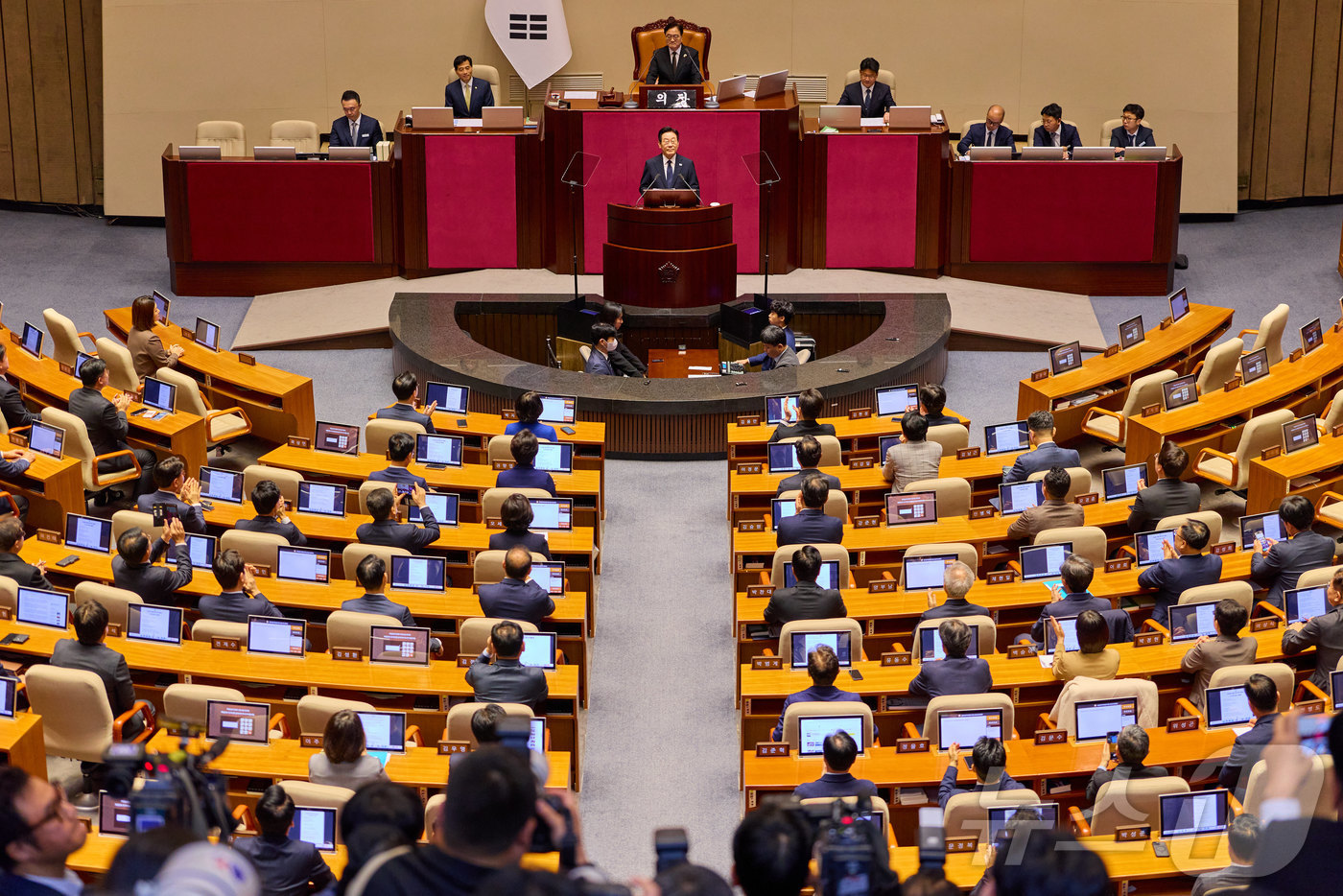 (서울=뉴스1) 이재명 기자 = 이재명 대통령이 4일 서울 여의도 국회 본회의장에서 2026년도 예산안 및 기금운용계획안에 대한 시정연설을 하고 있다. (대통령실 제공. 재판매 및 DB 금지) 2025.11.4/뉴스1