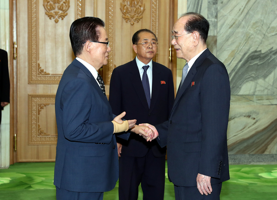 지난 2018년 9월 18일 평양 중구역 만수대의사당에서 열린 평양 남북정상회담 특별수행원-김영남 최고인민회의 상임위원장 면담에 앞서 김 상임위원장(오른쪽)이 민주평화당 박지원 의원과 인사하고 있다. 사진 평양사진공동취재단 |