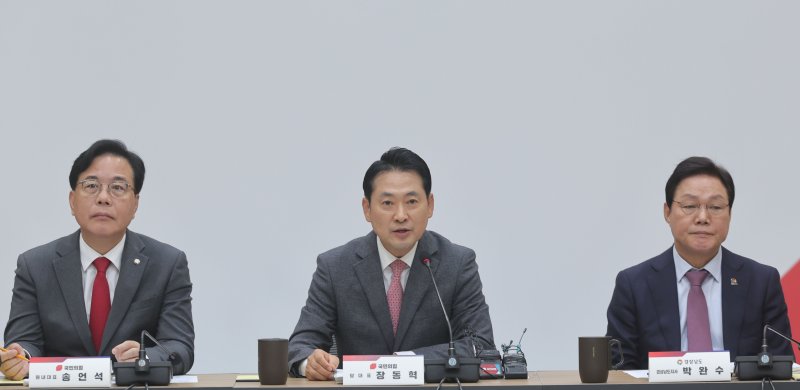 4일 경남 창원시 경남도청에서 열린 국민의힘-부산·울산·경남 지역민생 예산정책협의회에서 국민의힘 장동혁 대표(가운데)가 발언하고 있다. 연합뉴스 |