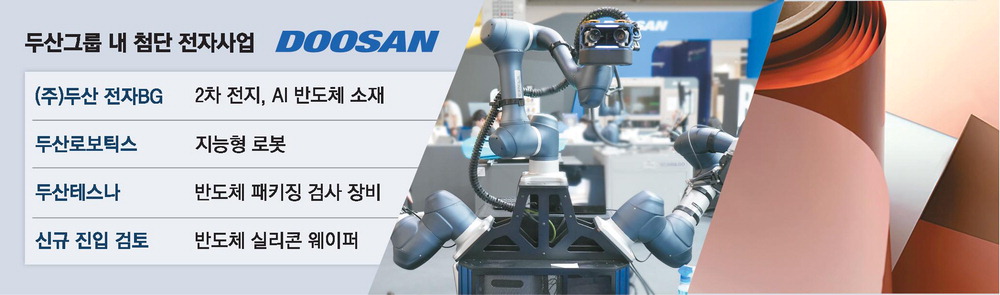 전자BG는 지난해 매출 1조63억원을 기록하며 두산 연결 매출의 5.55%를 담당했지만, 올해 상반기에는 매출 8788억원으로 9.1%를 차지할 만큼 비중이 커졌다. PCB 생산 시절 축적한 기술은 이제 2차전지용 동박, 반도체 소재, 로봇 제어 기술 등에 널리 활용되고 있다.