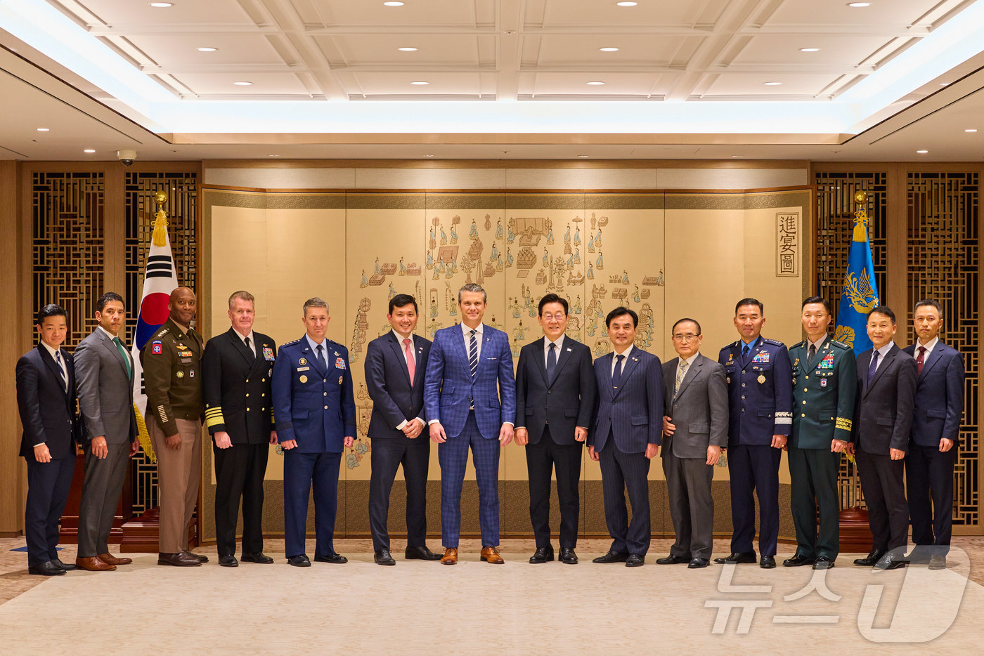 (서울=뉴스1) 이재명 기자 = 이재명 대통령이 4일 서울 용산 대통령실 청사에서 피트 헤그세스 미국 국방부 장관 접견하며 참석자들과 기념촬영을 하고 있다. (대통령실 제공. 재판매 및 DB 금지) 2025.11.4/뉴스1