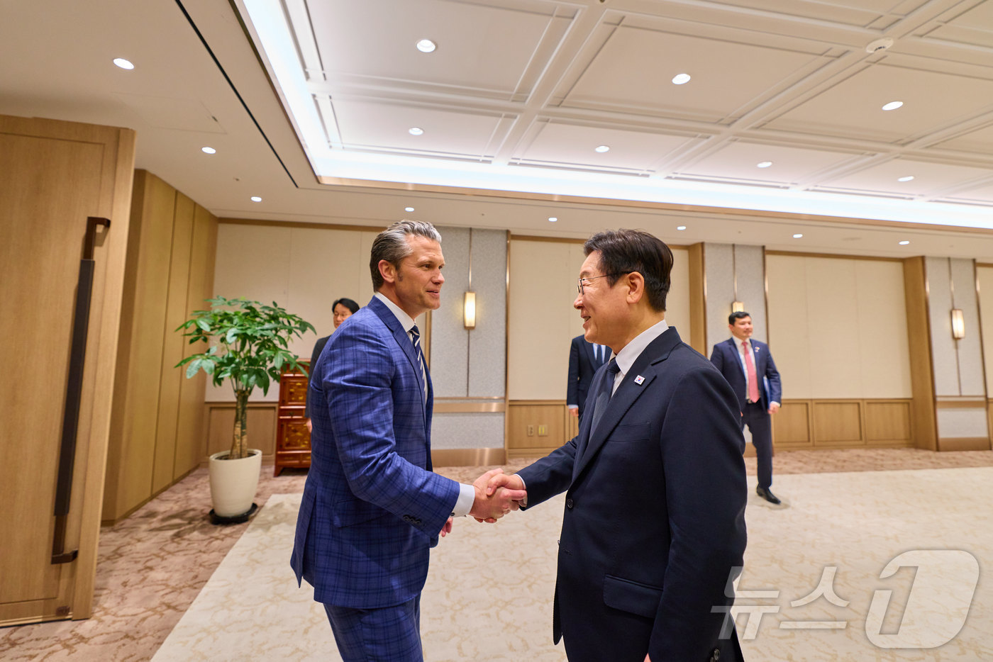 (서울=뉴스1) 이재명 기자 = 이재명 대통령이 4일 서울 용산 대통령실 청사에서 피트 헤그세스 미국 국방부 장관 접견에 앞서 악수하고 있다. (대통령실 제공. 재판매 및 DB 금지) 2025.11.4/뉴스1